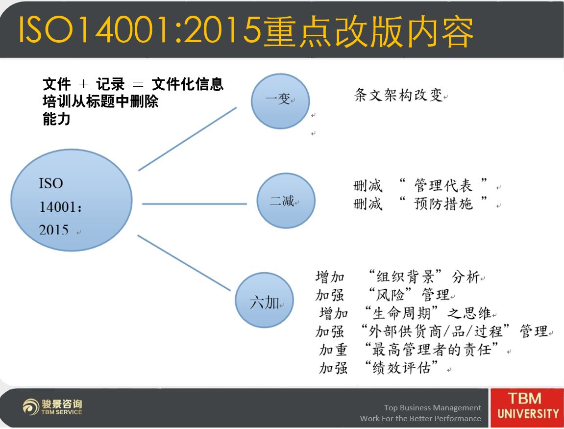 ISO14001:2015標準重磅修改,并于2015年09月推出。OHSAS18001:2007也將改版為ISO45001:2016版,目前草案已經發布。以已經發布正式版的ISO14001:2015為例,本次的變化相比ISO14001:2004有很大的變化。下圖為ISO14001:2015主要變化概覽。