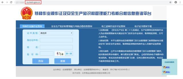 特種作業操作證及安全生產知識和管理能力考核合格信息查詢平臺新網址中的“mem”便是與證書相對應的“應急管理部”的英文縮寫,“gov”則是英文“government”的縮寫,“cx”就是中文“查詢”的拼音首字母啦!