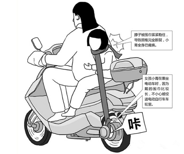 我省地勢平緩,電動車數量龐大,電動車載人現象非常普遍,尤其是上下學接送孩子,更為常見。冬天天冷,孩子穿衣服多,又常戴帽子圍巾,如果衣角褲腳寬松,帽子帶子、圍巾過長,或者衣物上裝飾性物品冗長,極易絞進電動車輪,發生頸椎損傷,甚至頸椎斷裂的傷害,或者從電動車上墜落。一旦發生頸椎損傷,就會出現生命危險,治療效果很差。