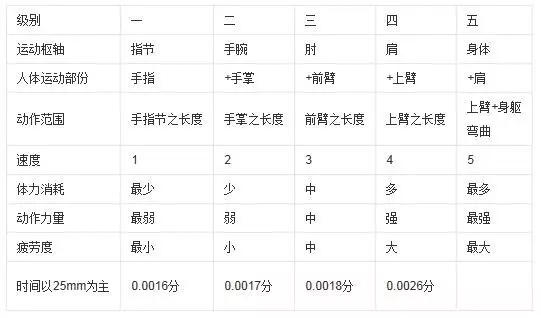 說明:人體的手動作可分成下列五個等級。愈底等級的動作,所耗費的時間愈短愈不容易疲勞。為使工作能有高效率,及不易疲勞,我們必須盡量利用低等級的動作來工作。所以工作物/工具與搬運距離應愈近愈好使工作的范圍盡量縮小。