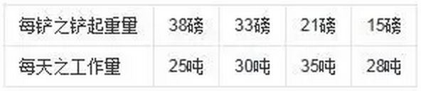 早期之煤炭均以人工方式,以鏟子將煤炭鏟入火車上。每次鏟起之重量不同時會影響其工作之速度。也同時會影響其動量。經研究的結果如下,發現最適當的重量是每次鏟起21磅,則每天之工作量最高為35噸。