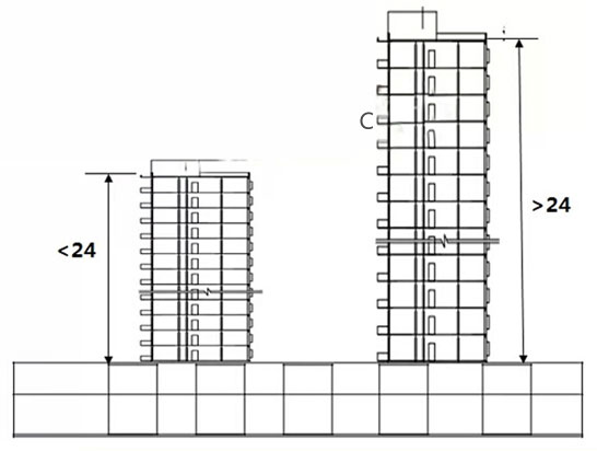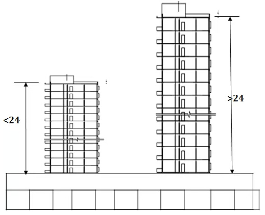 問題3:平臺上由建筑高度超過24米(超過10層的住宅)和未超過24米的多個建筑相連組成的建筑群體,是否應全部理解為高層建筑,還是可以按具體情況分別獨立區分為高層建筑和多層建筑?