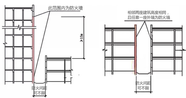 新增:相鄰兩座高度相同的一、二級耐火等級建筑中相鄰任—側外墻為防火墻,屋面板的耐火極限不低于1.00h時,其防火間距不限。
