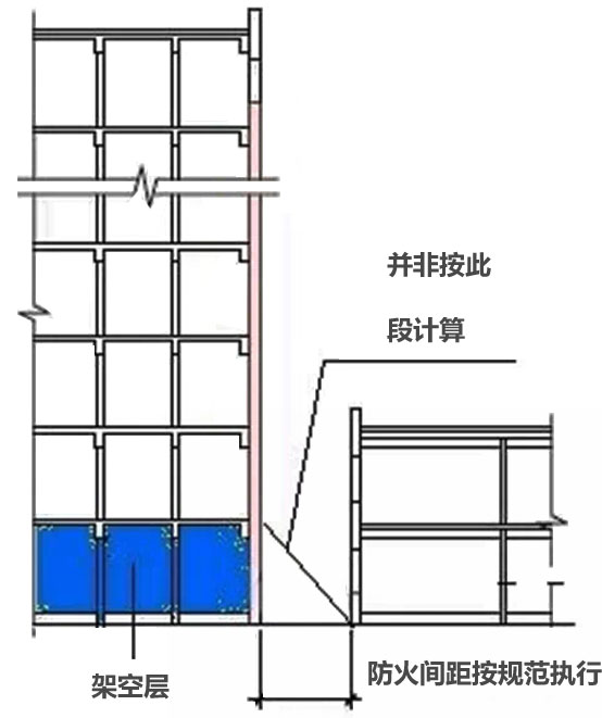 問題4:當高層建筑底層架空,用作休閑綠化時,該高層建筑與單層、多層建筑之間的防火間距如何控制?規范沒有這方面的要求。