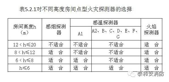 1對不同高度的房間,可按表5.2.1選擇點型火災探測器: