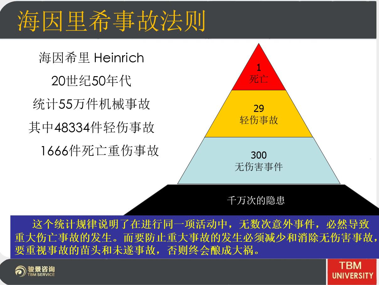 海因里奇原則(Heinrich Principle)教導我們?nèi)绻页鲈斐蓢乐匕踩鹿实母驹?,就必須對最小的安全隱患予以重視。同樣的原則也適用5S,消除浪費和增強質(zhì)量意識。精益管理需要每個人對最小的問題也要予以警惕。持續(xù)的教育和保持高度的敏感性是必須的,同時防止對異常狀態(tài)形成不良習慣。