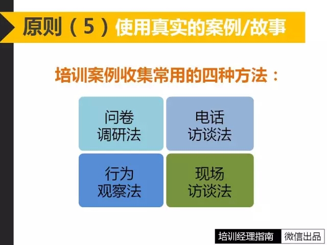 5、在講述一個原理和道理時,真實的案例和故事既可以幫助學員理解,又可以保持學員的注意力和興趣。如果每個學員都將自己的體驗講出來,并相互參考和借鑒,成人學習的互動性就體現(xiàn)出來。一個老師的經(jīng)歷無論如何不能替代眾多學員的經(jīng)歷,而且學員自身的經(jīng)歷比老師的更貼近學員。