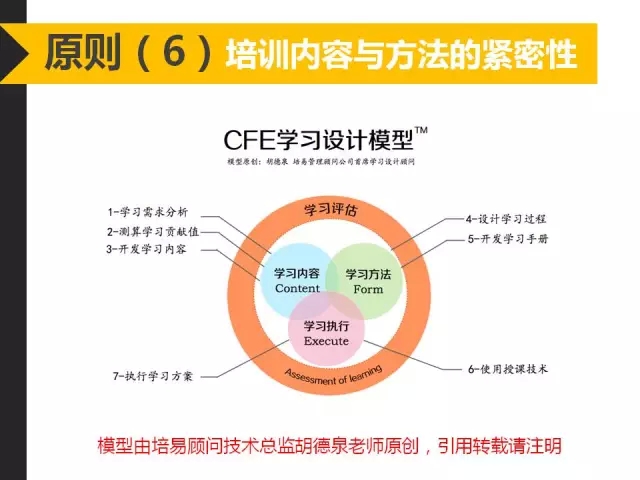 6、一個高效的培訓總是環(huán)環(huán)相扣,有的培訓所涉及的內容過多,采用的形式和方法花俏,導致脫離主題,在培訓的每個環(huán)節(jié),甚至游戲都應該圍繞主題和目標,為了排除學員緊張和恐懼心理的破冰活動可以與主題無關,但是不能占據(jù)太多的時間。上圖CFE模型提供了一個有效培訓必備的三個要素指標:C-內容指數(shù)、F-形式指數(shù)、E-執(zhí)行指數(shù),回復“CFE”查看詳細解讀
