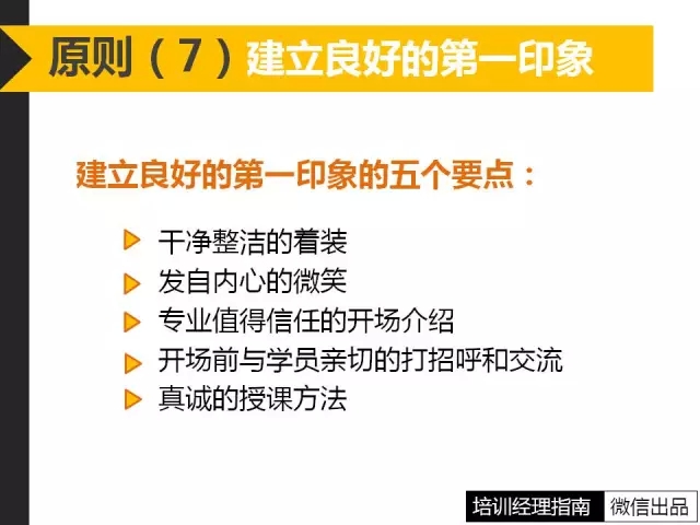 7、心理學中顯示人對人的第一印象起決定性的作用,每個人對其他人的判斷都是主觀和感性的。在培訓現(xiàn)場老師是否能抓住學員的思想,開始的五分鐘是很重要的,老師需要在5分鐘之內向學員推銷自己和說出自己的觀點與別人不同,就像拋出魚餌一樣,引誘學員對學習產(chǎn)生好奇和興趣。