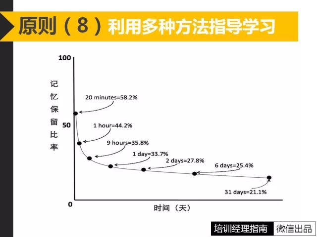 8、學習心理學家告訴我們,一個人的學習吸收曲線顯示成人在一種方式的學習40分鐘后吸收幾乎等于零,意味著老師需要經(jīng)常變化學習方法和方式,來保證學習的吸收。而艾賓浩斯遺忘曲線則告訴我們,學習一天后,如果不抓緊復習,就只剩下原來學習的33.7%,隨著時間的推移,遺忘的速度減慢,遺忘的數(shù)量也就減少。所以培訓師需要在課堂中利用多種不同刺激度的教學活動增加學員的注意性。