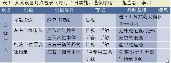 5.現實。標準必須是現實的,即可操作的。標準的可操作性非常重要。可操作性差是國內許多企業的通病。我們可以在許多企業車間的墻上看到操作規程、設備保養等標準,我們比較以下兩個表,感受一下什么是可操作性。