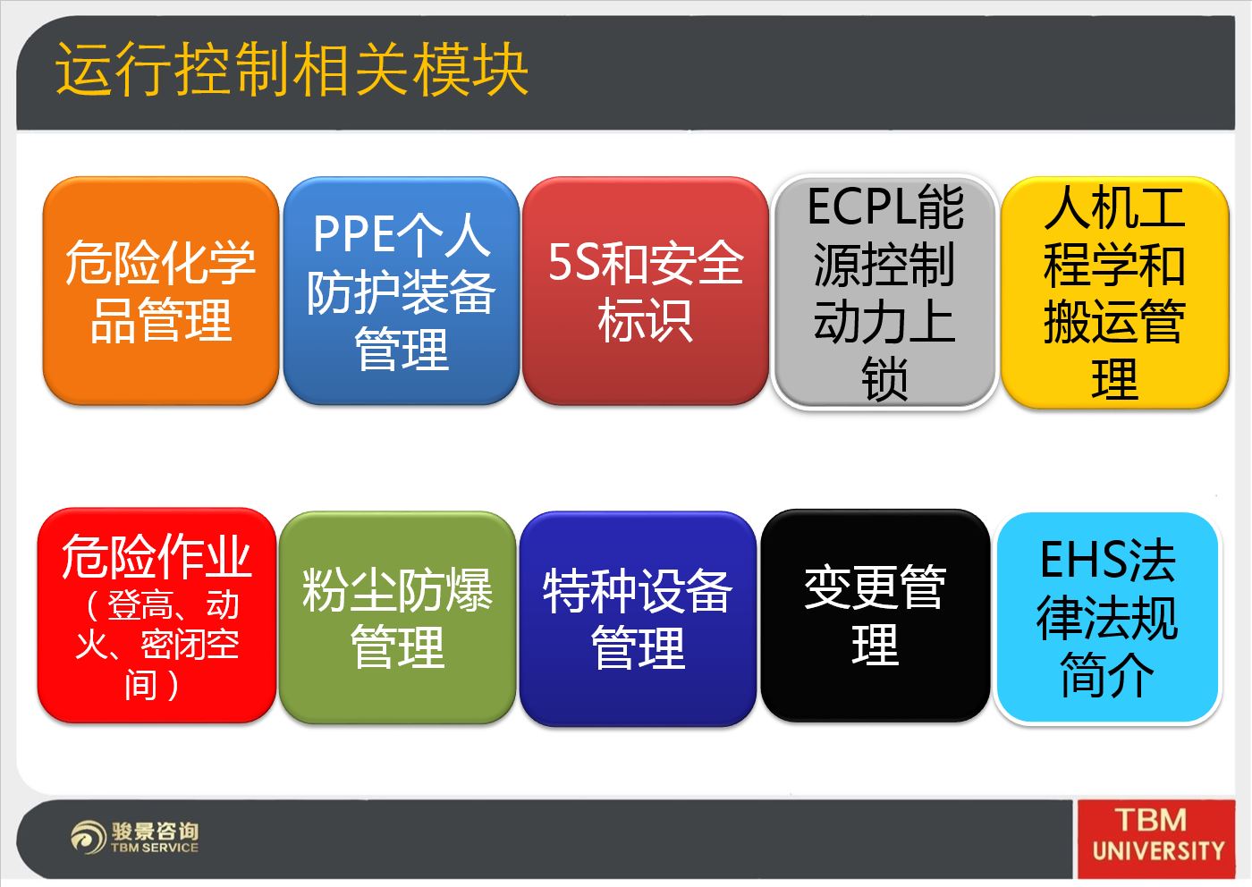 本次課程重點(diǎn)講述了5S和標(biāo)識(shí)管理,危險(xiǎn)化學(xué)品管理以及粉塵防爆管理以及ECPL簡介等內(nèi)容。