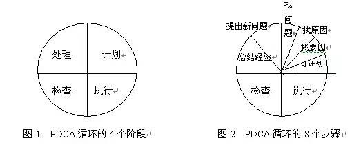 PDCA循環(huán)應(yīng)用了科學(xué)的統(tǒng)計(jì)觀念和處理方法。作為推動(dòng)工作、發(fā)現(xiàn)問題和解決問題的有效工具,典型的模式被稱為“四個(gè)階段”、“八個(gè)步驟”。