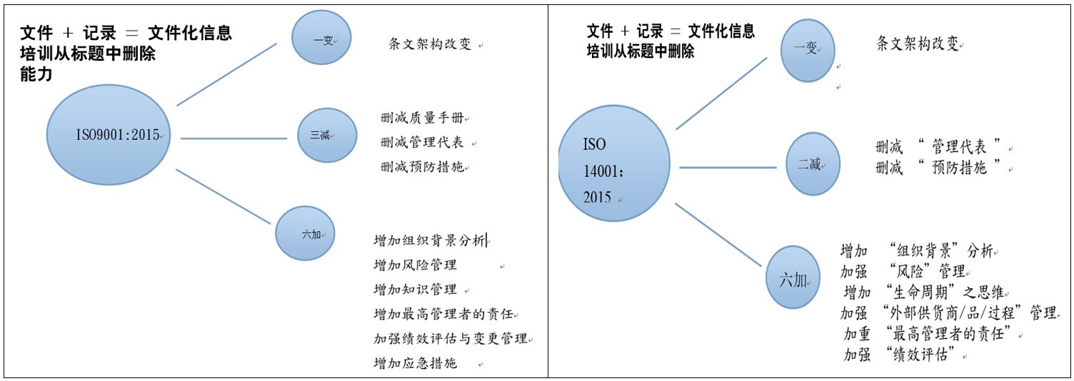 新版環(huán)境和質(zhì)量管理體系手冊(cè)和文件編寫(xiě)培訓(xùn)在中天科技股份有限公司圓滿完成,由于本次ISO9001:2015 和 ISO14001:2015 改版較大,特別是在管理理念和對(duì)最高管理層的管理要求更加明確和突出,重點(diǎn)改版要點(diǎn)如下圖: