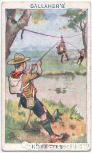 “先將一根結實的繩索系到一棵樹上,然后讓一個小男孩游過小河,將繩索的另一端系到對岸的另一棵樹上。制作吊籃,將吊籃固定在一個動環(huán)上或一個滑輪組上。把一根細繩與吊籃固定在一起,小河的兩岸各站一個童子軍拉細繩,這樣那些不會游泳的人便可以安全過河了。”