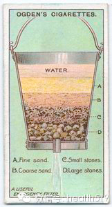 “在一個普普通通的非常干凈的鍍鋅水桶底部鉆一個孔,裝上一小段管子,便可以做成一臺簡便、高效的過濾器。水通過裝填好的細砂層、粗砂層、精選沙礫層和石子層的過濾,滲透到桶的底部,就成了潔凈的水。”