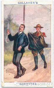“如圖所示,一根童子軍的棍棒、一支拐杖、甚至一塊手絹或一頂帽子都可抓在手里防身。狗在咬你之前總是試圖用爪子撲掉你的防身物,這樣你就可以借機一腳致殘瘋狗。