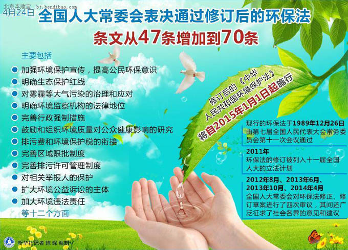 圖表:全國人大常委會表決通過修訂后的環保法 條文從47條增加到70條 新華社記者 陳琛 編制