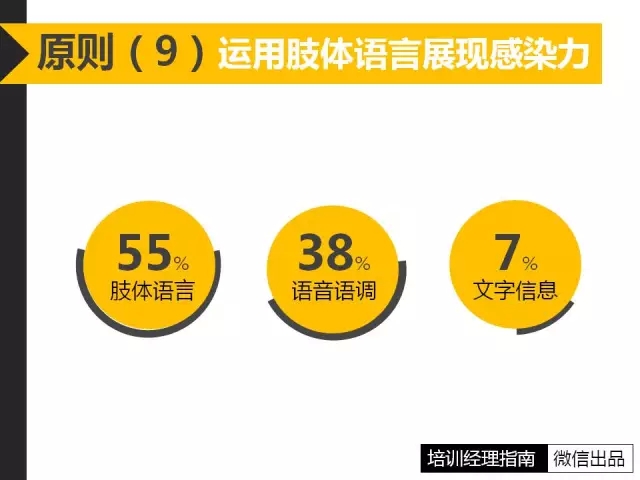 9、學習心理學家發(fā)現(xiàn)成人從外界獲取信息中,文字信息僅占7%,肢體語言占55%,而語音和語調占38%。這就說明肢體語言在信息傳遞和溝通中的重要性,有感染力的培訓師擅長運用肢體語言增加自己語言的說服力和感染力,令學員產生信任,甚至崇拜,而且深深地感染了學員的內心,這種影響力光靠語言的力量是不夠的。