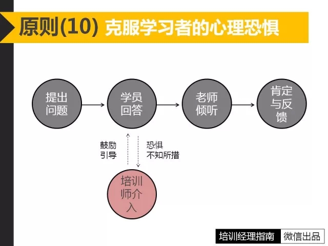10、在成人的培訓的過程中,當被提問時表現(xiàn)出來的就是在培訓中非常拘謹和嚴肅,不敢回答問題,怕回答錯誤;而也不愿向老師提問,只是被動地聽,而沒有與老師互動和參與各種學習活動。培訓師看到這種情況,通常會做一個‘破冰’的活動,請學員做一些簡單的活動和熱身,消除學員緊張和恐懼的心理,讓學員之間和老師之間先熟悉一下,等這些心理消除以后,再開始講正式的內容。