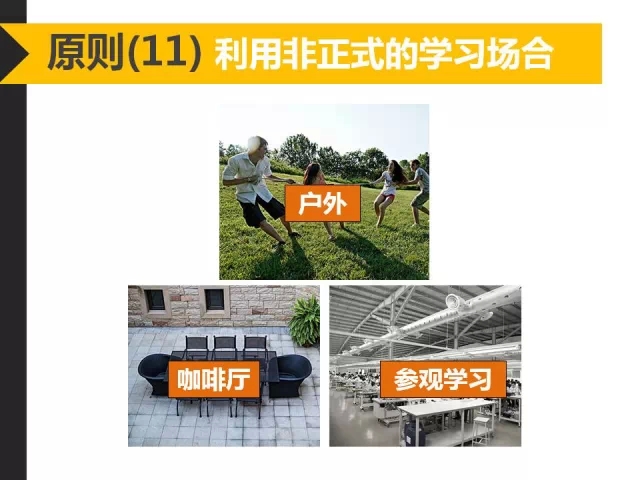 11、為了避免成人的緊張和恐懼的心理,所有大多數(shù)培訓都是在非辦公場所,可能是酒店,擺放方式是相對輕松和休閑的分組或者圍成一個U字型。這樣的環(huán)境容易讓學員和學員、老師造成一種寬松、愉快的心理,增加學習的參與程度和學習氣氛,提高培訓的效果。也能嘗試不同的學習場合: