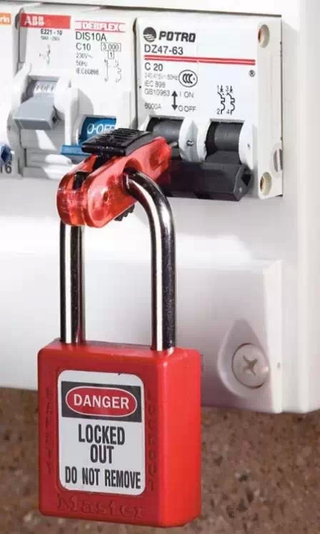 5. 上鎖和掛牌,在能源的斷開裝置上上鎖;鎖和標(biāo)簽,必須清晰地顯示誰該使用,誰該上鎖掛牌;如果多人同時在一臺機(jī)器設(shè)備上工作,每個人都必須使用他自己的鎖,在這種情況下,要有一個可以鎖幾把鎖的上鎖裝置;