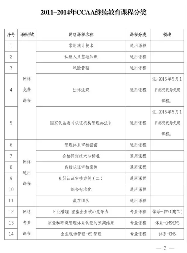 《CCAA認(rèn)證人員繼續(xù)教育管理方案》(第2版)(中認(rèn)協(xié)培【2015】77號(hào))已經(jīng)發(fā)布,CCAA將2011-2014年經(jīng)CCAA確認(rèn)的89門繼續(xù)教育課程按方案規(guī)定的課程框架重新劃分為通用課程、專業(yè)課程2大類, 共5種課程形式,包括:網(wǎng)絡(luò)免費(fèi)課程、網(wǎng)絡(luò)通用課程、網(wǎng)絡(luò)專業(yè)課程及面授通用課程、面授專業(yè)課程(詳見(jiàn)附件),并對(duì)繼續(xù)教育課程選擇要求做如下說(shuō)明: