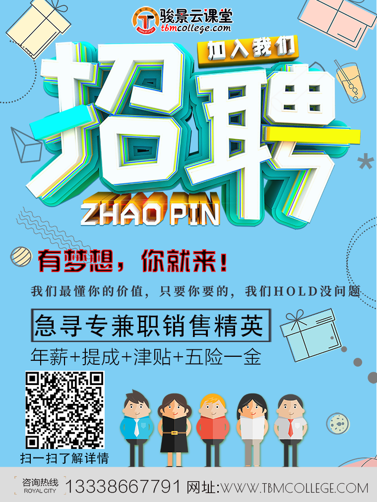 成為駿景云課堂的兼職網課代理人,可以分銷駿景云課堂平臺的爆品課程及優質課程,成為推廣員后,系統默認您的專屬標記。一旦轉發任一門系列課,新學員通過您分享專屬課程(免費課和付費課)鏈接成功報名后,學員將歸屬給該代理人。您將有高額的分紅(后臺自動分配)。同時我們還將支付每月200元的網絡推廣費,即不耽誤您的時間,也不影響您的工作。
