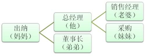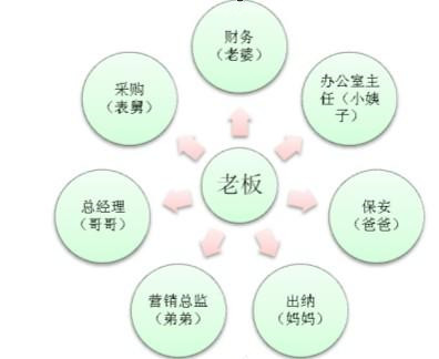 他是總經理,他弟弟是董事長,他媽媽做出納,老婆做銷售經理,采購是他妹妹。結果,現在媽媽都70多歲了,還不退休,他呢,做任何的工作都要向媽媽匯報,因為按照家庭關系來說,她是他媽媽,是他的行政長官。
