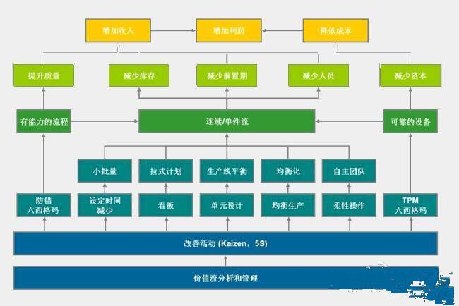 精益運營是站在更高的層面和更系統的角度發展應用傳統的精益生產方法。精益生產是在 “豐田生產系統”基礎上發展來的,但在范圍、理念和應用上都超出了豐田生產系統。對精益生產較嚴密的描述是:通過杜絕生產全過程的一切浪費,以持續地改進制造系統,來實現客戶最大滿意的一組原則、觀念和技術。有別于六西格瑪,精益是東方的思維方式,講究從宏觀的角度出發,整體實施來解決問題,是一種類比法。將某處的解決方案復制到其他相似的地方。精益適合用于解決與時間有關的問題,如交付期,準時率,周期等。精益是從宏觀角度VSM方面來看待問題。通過全面的價值管理,找出影響整個流程的浪費點,實施改善。