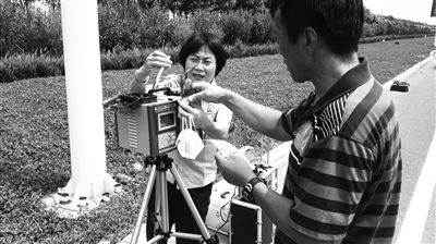 天津市環(huán)境應(yīng)急監(jiān)測人員正在用儀器監(jiān)測采集空氣中有無氰化物樣品。 本報(bào)記者郭文生攝