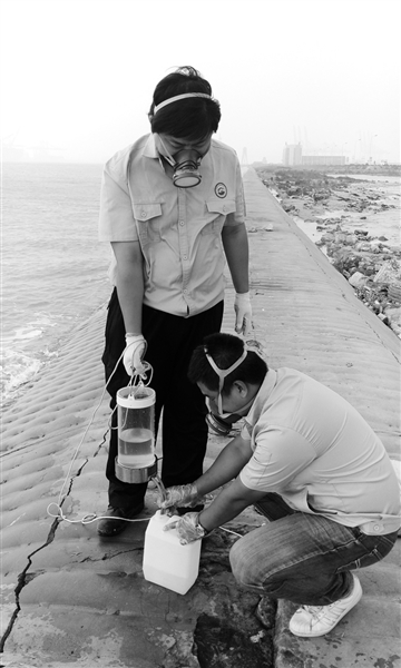 天津市環(huán)境應(yīng)急監(jiān)測人員正在海河入海口監(jiān)測點(diǎn)位采集水樣,密切監(jiān)測渤海灣水質(zhì)情況。 本報(bào)記者郭文生攝