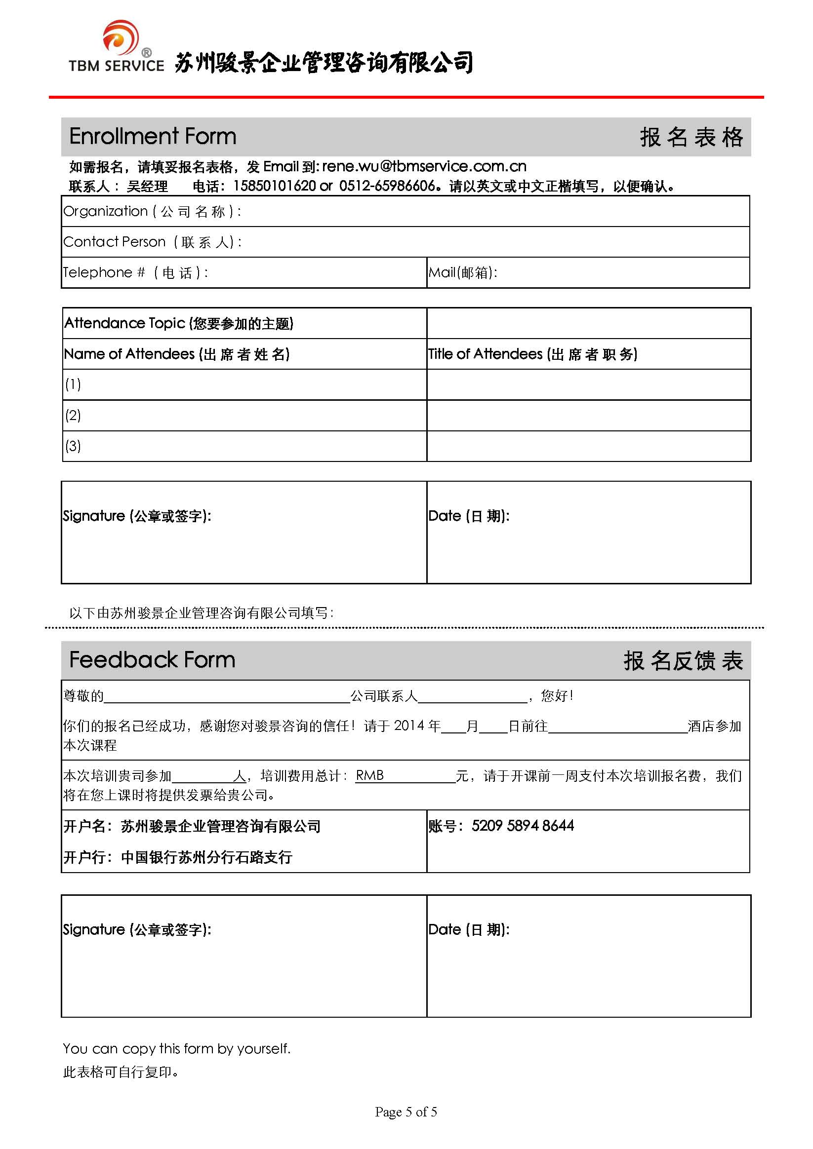 Thank you very much for your trust in TBM Service. 非常感謝貴公司對駿景咨詢的信任! We sincerely invite you to present this training. We would like listening your voice and providing the assistance accordingly. 誠邀您參加本次培訓,我們非常愿意與您交流,為您提供幫助。