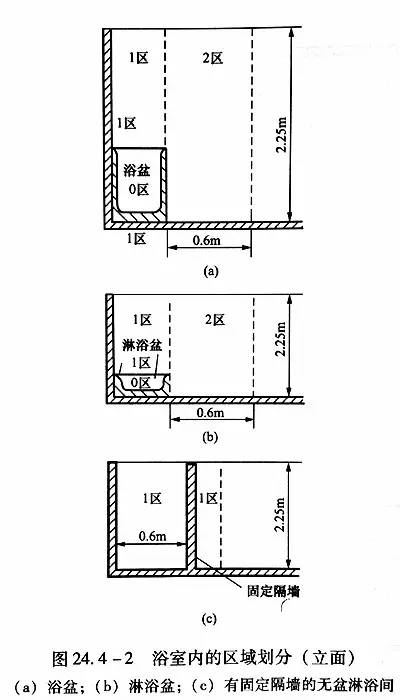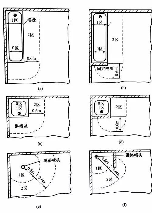 1區—圍繞浴盆或淋浴盆外邊緣的垂直面內,或距淋浴噴嘴0.6m的垂直面內,其高度止于離地面2.25m處。