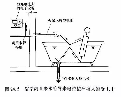 浴室內的電擊事故往往并非因使用有故障的用電器具而引起,而是因沐浴人同時接觸不同電位的導電部分而引起。如果因種種原因浴室內出現電位差,即使其值不過十幾伏,也能引起電擊死亡事故。浴室中有冷、熱水管,排水管,采暖管等各種金屬管道和金屬構件,這些金屬可導電部分常成為傳入不同電位的路徑。如圖24.5所示,浴室近旁一房間內的電子設備需將其金屬外殼接地,