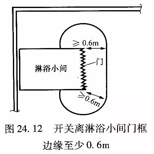 浴室內墻上小開關因開關外露的金屬固定螺栓與開關內帶電部分間距未滿足特別潮濕環境的間距要求,除采用配有絕緣材料制作的遮罩的開關外,為安全起見對一般小開關的安裝位置也有規定。在 0、1區及2區內不允許安裝開關。如浴室內有淋浴小間,則開關的安裝位置應至少離淋浴小間的門框邊緣0.6m,如圖24.12所示。