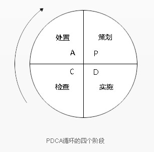 PDCA循環是能使任何一項活動有效進行的一種合乎邏輯的工作程序,特別是在企業的質量管理中得到了廣泛的應用。在PDCA循環中,“策劃(P)—實施 (D)—檢查(C)—處理(A)”的管理循環是現場質量保證體系運行的基本方式,它反映了不斷提高質量應遵循的科學程序。PDCA循環包括了四個階段,如下圖所示。