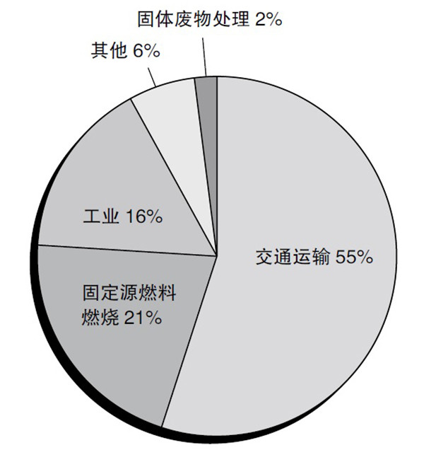 美國原生空氣污染物來源。原生空氣污染物就是直接排入大氣層的物質,其數量足以對人類健康或對環境造成不良影響。交通運輸是人類造成空氣污染最大的單項來源,其次是使用燃料的發電廠和工廠等固定源。