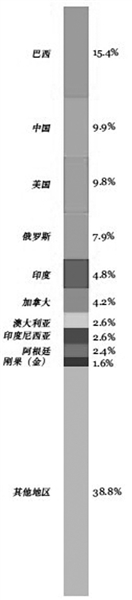 2008年,10個國家的總生物承載力占地球總承載力的60%以上。國家生態(tài)承載力按順序大小為:巴西、中國、美國、俄羅斯等。其他地區(qū)生態(tài)承載力總和為38.8%。