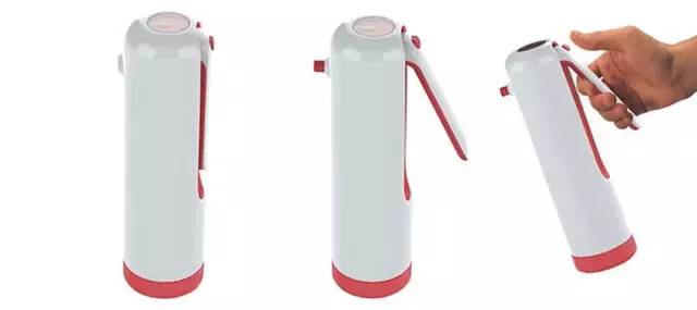 下面兩款都是為廚房專門設計的,廚房是發生火災的高發區,所以在廚房設置小型滅火器也是必要的。當然外表的設計考慮到了廚房油污多,將之設計成簡單的形態也是為了便于清潔,并且在產品的手握處下方也巧妙的處理成了防滑的材質。