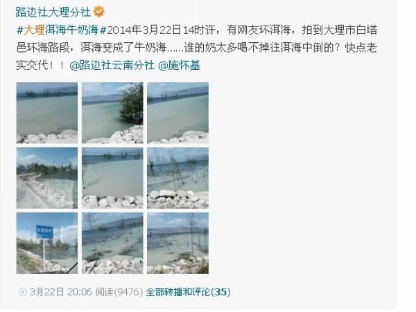 3月24日,大理州環(huán)保局回應稱,大理州環(huán)境監(jiān)察支隊針對網(wǎng)友反映的大理市白塔邑環(huán)海路段洱海出現(xiàn)白色渾濁物的問題,已于3月19日進行了監(jiān)察,并要求大理市政府限期10天完成整改,責成大理市環(huán)境保護局對所涉及企業(yè)依法進行處罰。