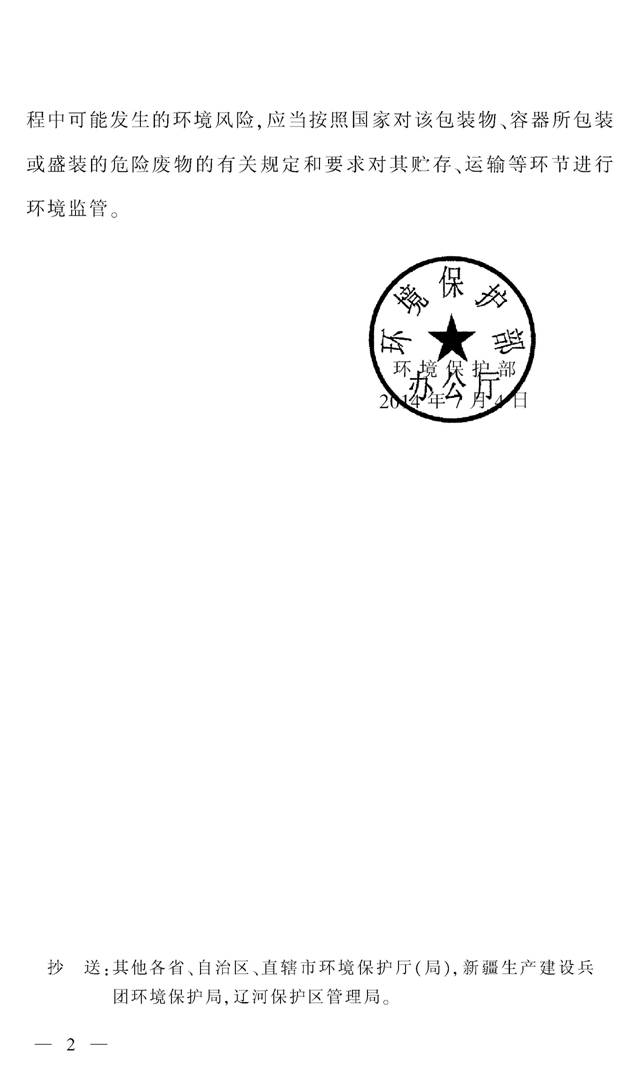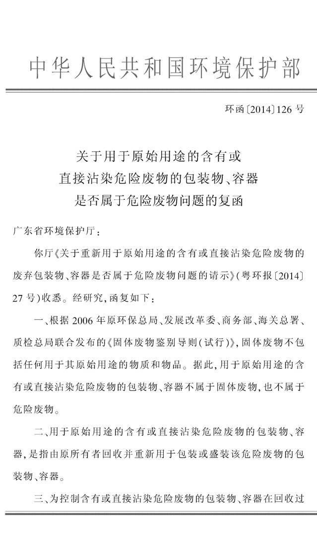 對(duì)于用于原始用途的含有或直接沾染危險(xiǎn)廢物的包裝物、容器是否屬于危險(xiǎn)廢物問(wèn)題的復(fù)函 環(huán)境保護(hù)部 環(huán)函〔2014〕126號(hào)