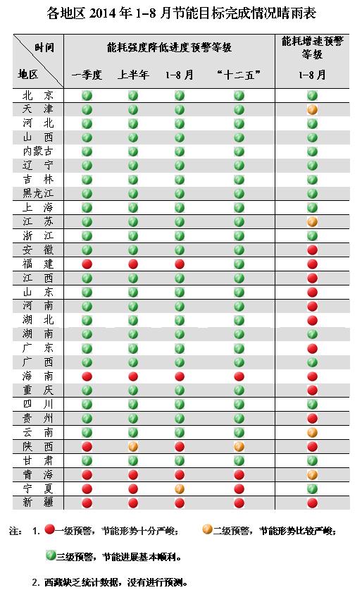 近日(2014年9月30日) ,國家發(fā)布了各地區(qū)2014年1-8月節(jié)能目標完成情況晴雨表。通過對各地區(qū)節(jié)能形勢進行分析,對照各地“十二五”年均節(jié)能任務(wù),1-8月,福建、海南、陜西、青海、新疆等5個地區(qū)預(yù)警等級為一級,節(jié)能形勢十分嚴峻;寧夏預(yù)警等級為二級,節(jié)能形勢比較嚴峻;北京、天津、河北、山西、內(nèi)蒙古、遼寧、吉林、黑龍江、上海、江蘇、浙江、安徽、江西、山東、河南、湖北、湖南、廣東、廣西、重慶、四川、貴州、云南、甘肅等24個地區(qū)預(yù)警等級為三級,節(jié)能工作進展基本順利。西藏缺乏統(tǒng)計數(shù)據(jù),沒有進行預(yù)測。與上半年相比,陜西由二級預(yù)警上升為一級預(yù)警,寧夏由一級預(yù)警下降為二級預(yù)警。
