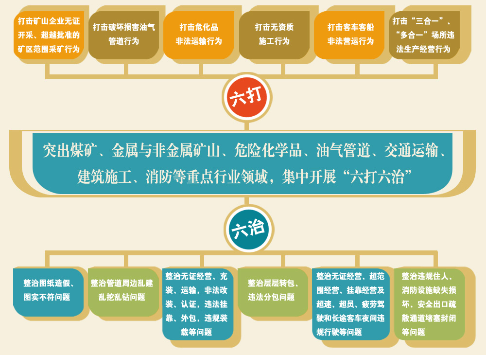 突出煤礦、金屬與非金屬礦山、危險化學(xué)品、油氣管道、交通運輸、建筑施工、消防等重點行業(yè)領(lǐng)域,集中開展“六打六治”: