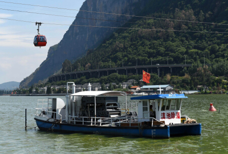一艘除藻船在昆明滇池草海內(nèi)準(zhǔn)備進(jìn)行除藻作業(yè) 藺以光攝